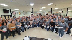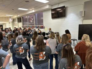 click to download audioThe choir of 130 sang the National Anthem and the HHS Alma Mater. Current Choir Director, Tracy Bean says the idea came from a community member.