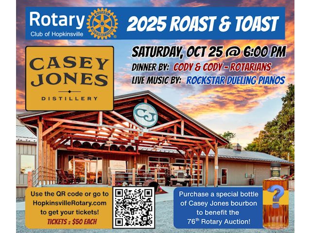 click to download audioTickets are $50 per person and include dinner and entertainment. They’re available online at HopkinsvilleRotary.com or at the Rotary office inside the War Memorial Building.