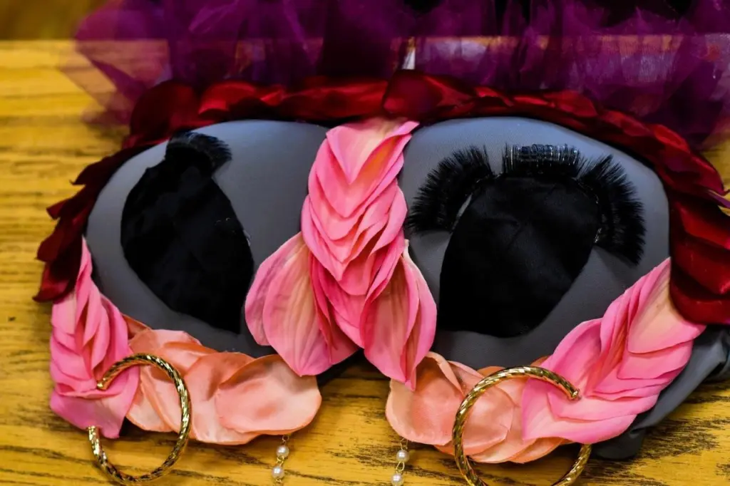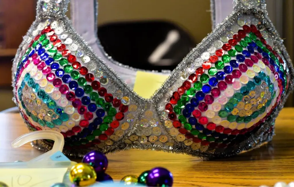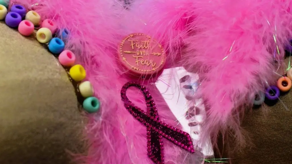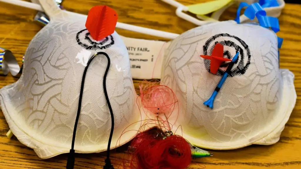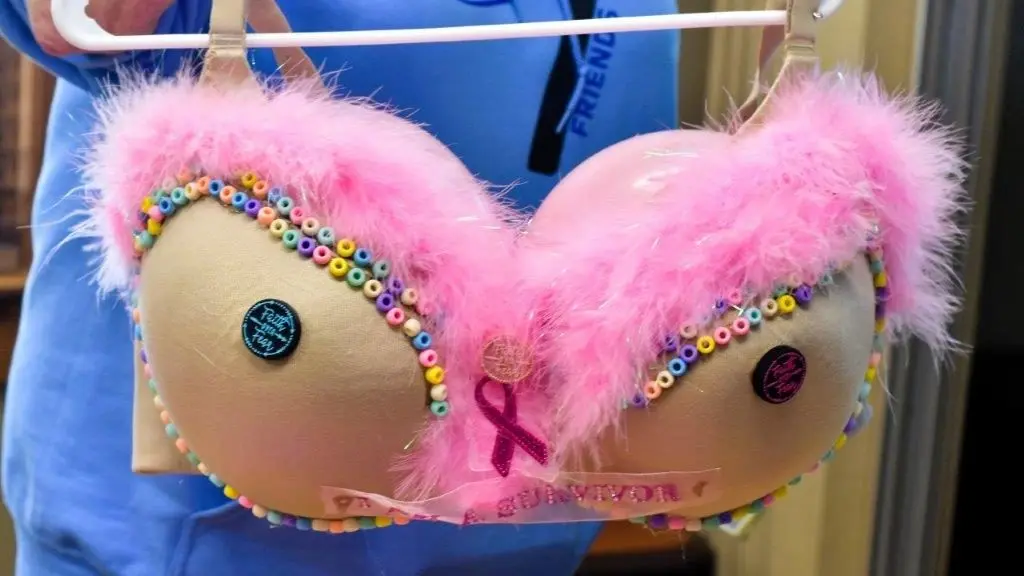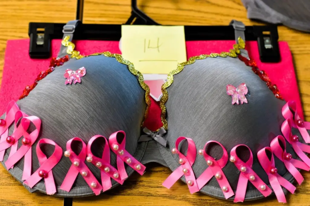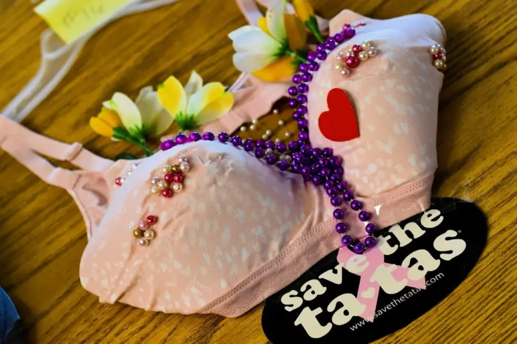 Linda Oiler was able to get a bumper sticker from her son, Jimmy, that said “Save the Tatas,” and she glued that to her artwork — while Liz Torkelson, formerly of Long Island, New York, built a “stripper bra,” stuffing hers with dollar bills while adding snowflakes and bells for tassels.