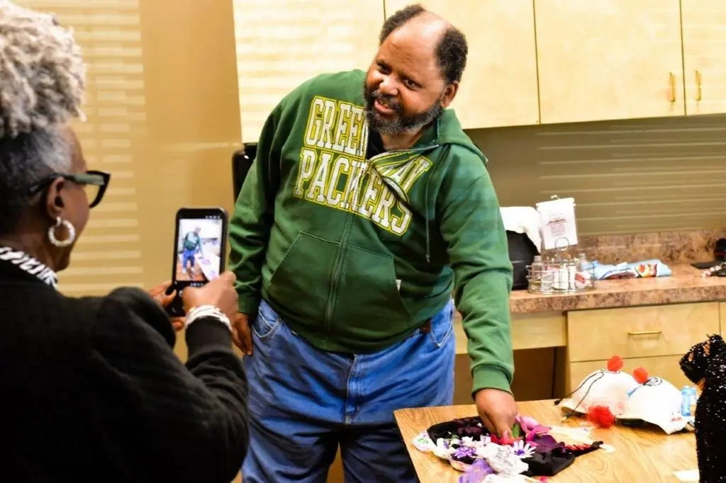 Carmelia Barnett, 73 years old, spent several hours over the course of three days sewing tinsel, elastic, sequence and peacock feathers in a nice arrangement — showcasing something someone might wear at a cocktail party.
