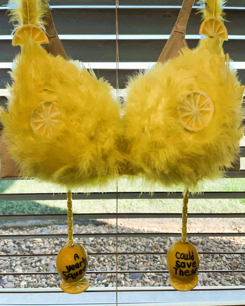 Later Thursday afternoon, Lawrence confirmed an after-party design arrived from Junia Thomas. Herself a breast cancer survivor, Thomas created a bra shaped like two feathery, fuzzy lemons. Dangling from the cups were lemon ornaments, with the right saying “a yearly squeeze,” and the left saying “can save these.”